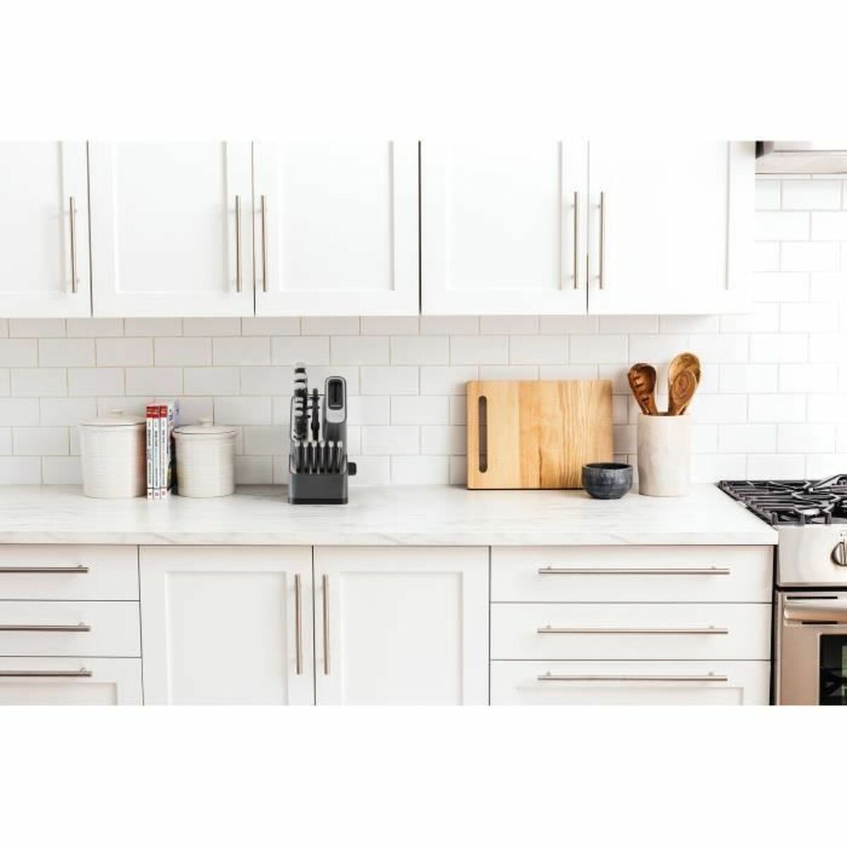 Le set de couteaux NINJA StaySharp de 14 pièces est un ensemble complet conçu pour répondre aux besoins essentiels en cuisine, fabriqué en acier inoxydable garantissant durabilité et résistance à la corrosion. Ce jeu présente un design moderne et élégant en noir, offrant une finition professionnelle et sobre qui s’intègre facilement dans tout environnement culinaire. Chaque couteau est doté d’une lame tranchante et de haute qualité facilitant une découpe précise et efficace de divers aliments, de la viande aux légumes, assurant un contrôle et une sécurité optimaux pour l’utilisateur. La grande variété de pièces permet d’aborder plusieurs tâches culinaires, améliorant la polyvalence et la fonctionnalité au quotidien. Grâce à son design StaySharp, les lames conservent un tranchant durable, réduisant la fréquence d’aiguisage et garantissant une performance constante dans le temps. L’ergonomie des manches assure une prise en main confortable et stable, aidant à éviter la fatigue lors d’une utilisation prolongée et offrant une meilleure maniabilité pour les découpes délicates ou exigeantes. Ce set est destiné aux amateurs comme aux professionnels recherchant un équipement de base solide, fiable et au style contemporain pour leur cuisine. En résumé, le set de couteaux NINJA StaySharp allie matériaux de qualité, diversité et design soigné pour faciliter les tâches culinaires quotidiennes, se positionnant comme un outil pratique et efficace pour ceux qui valorisent fonctionnalité et robustesse dans leurs ustensiles de cuisine.