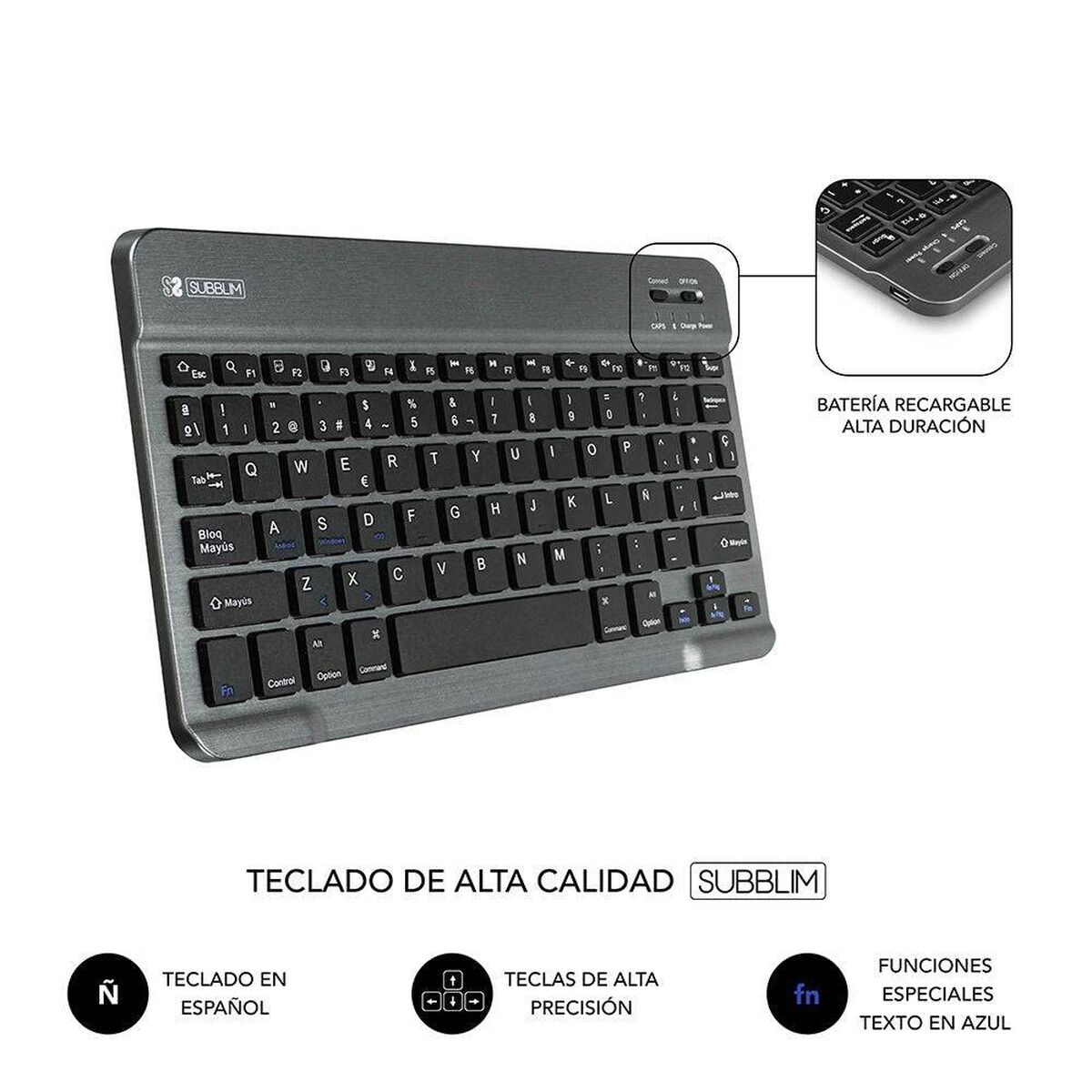 La housse pour tablette et clavier Subblim SUB-KT2-BT0002 est une solution polyvalente et fonctionnelle pour ceux qui souhaitent protéger leur appareil tout en augmentant leur productivité avec confort. Cet ensemble comprend un clavier QWERTY espagnol sans fil avec connexion Bluetooth, permettant une saisie rapide et précise, idéal pour le travail, les études ou le divertissement, tout en restant compatible avec pratiquement toute tablette de 9 à 10,1 pouces. Le clavier est entièrement rechargeable via connexion micro USB, garantissant une grande autonomie et la commodité de ne pas utiliser de piles jetables. Grâce à son design ultra-fin et ergonomique dans une élégante couleur grise, la housse offre un aspect moderne et professionnel sans ajouter de poids superflu, tandis que le mécanisme à ressort sous chaque touche procure une sensation tactile favorisant la rapidité et réduisant les erreurs de frappe par rapport à un écran tactile classique. Le clavier amovible se fixe grâce à un système magnétique robuste, permettant de passer facilement de l’utilisation du clavier à celle de la tablette seule, ce qui est très pratique pour le travail flexible ou les déplacements. De plus, la housse intègre un système d’arrêt automatique pour préserver la batterie et dispose d’un support réglable facilitant le choix de l’angle de vue le plus confortable pour lire, écrire ou regarder des contenus multimédias. Sa compatibilité universelle, l’accès total aux fonctions de la tablette même avec la housse, ainsi que les matériaux résistants utilisés pour sa fabrication font de cet accessoire Subblim un choix de premier plan dans sa catégorie. En résumé, la housse et clavier SUB-KT2-BT0002 offre protection, praticité et design à toute tablette compatible, alliant ergonomie et fonctionnalité pour un usage quotidien intensif et confortable.